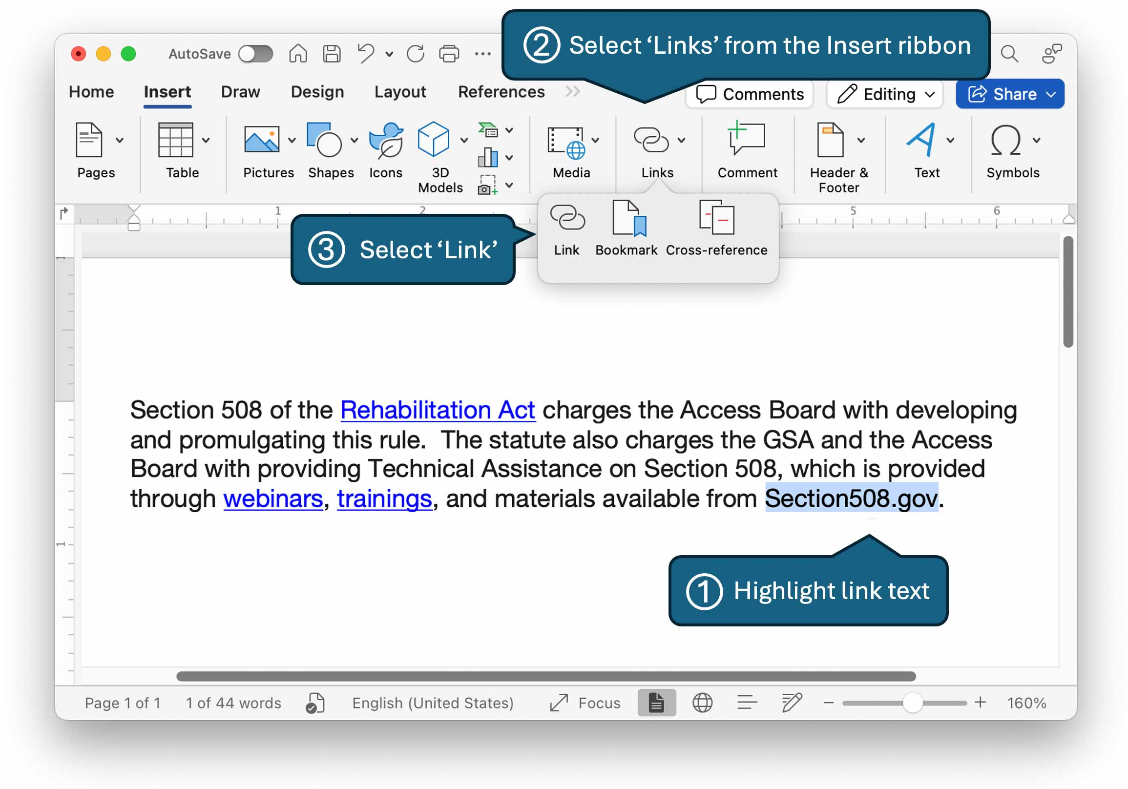 When including links, avoid using the full URL and vague terms like “click here” or “read more.” Instead, embed hyperlinks and use unique, descriptive text to describe the link’s destination.